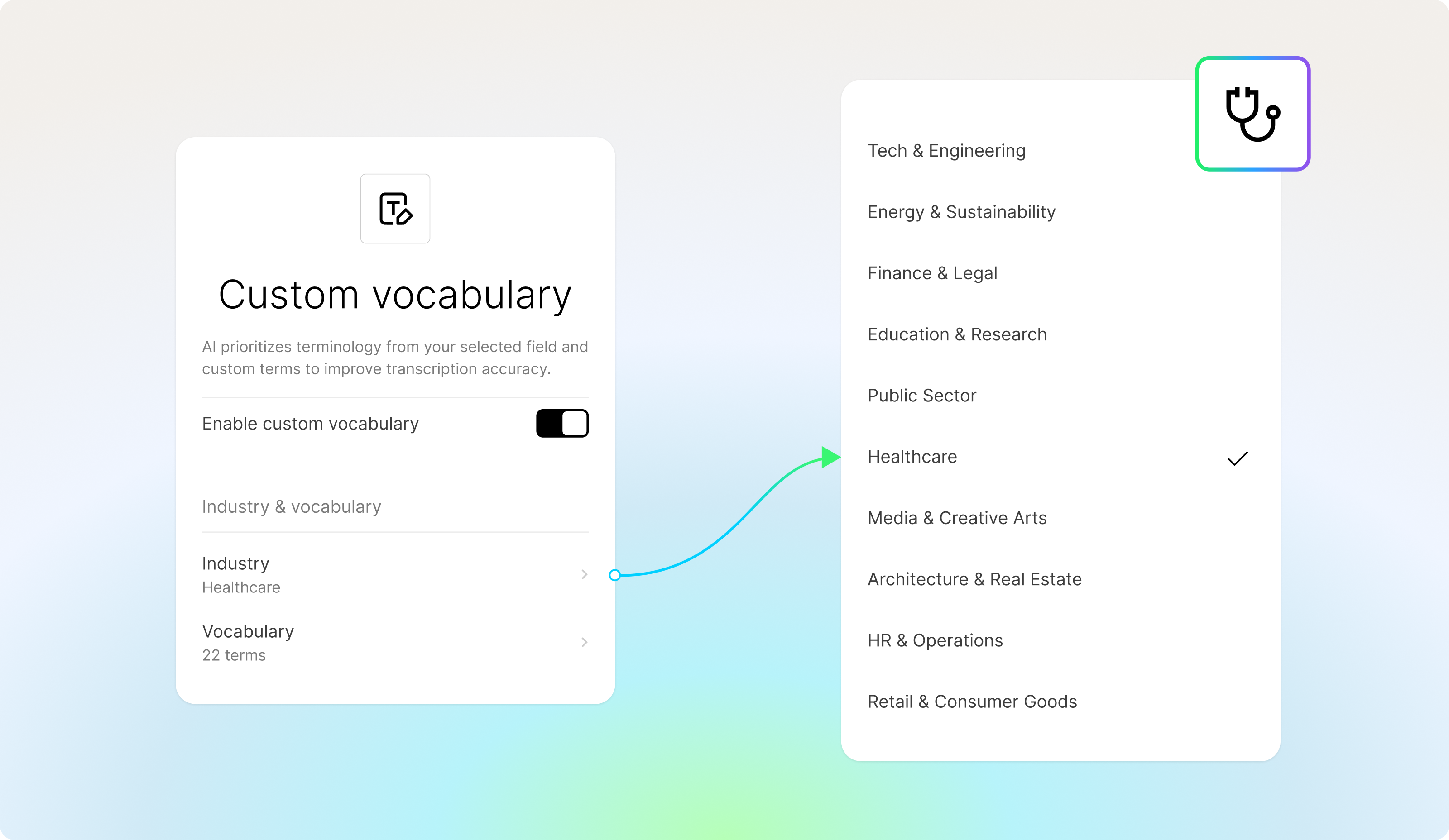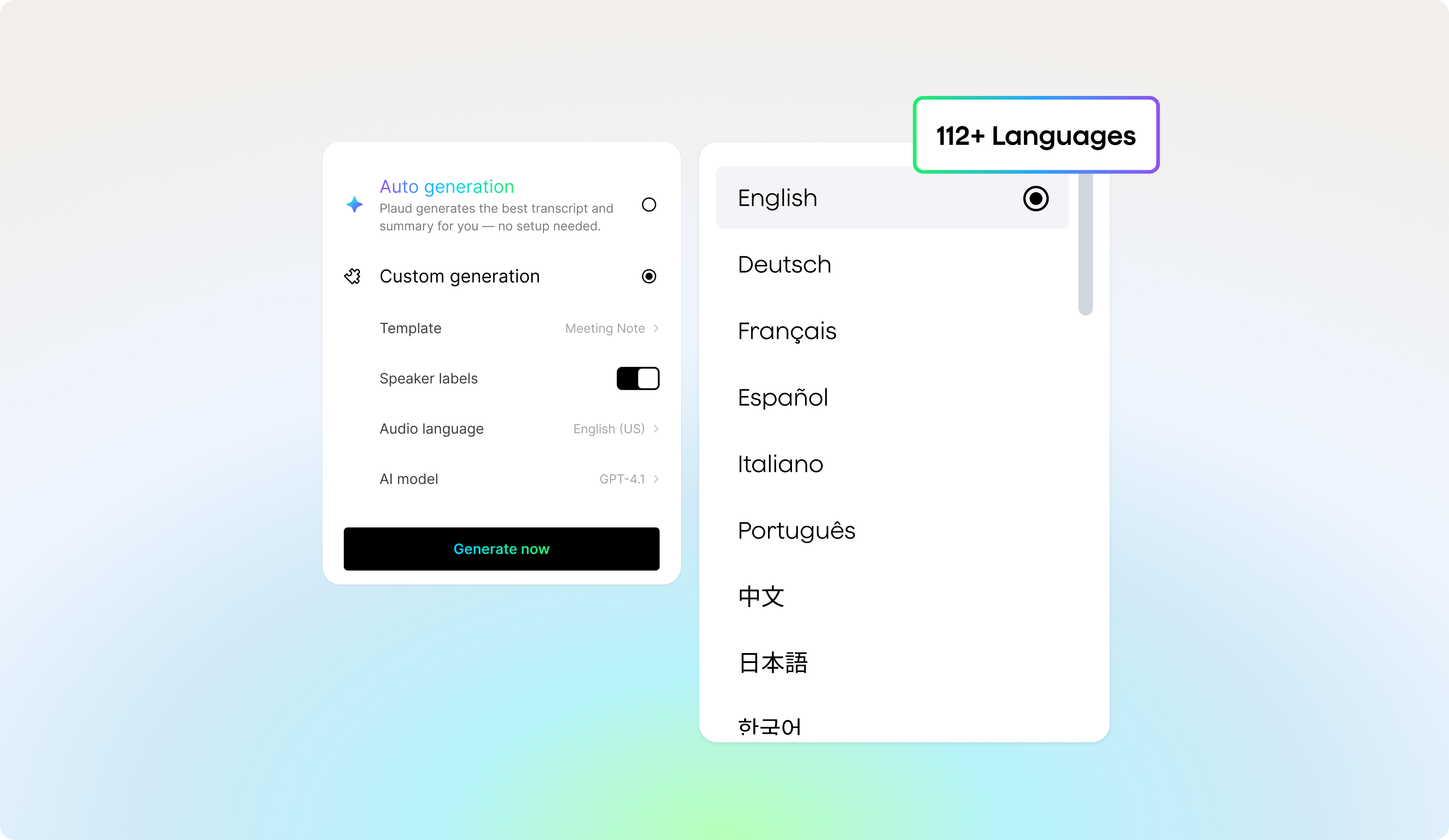 Auto-generation of transcripts and summaries using AI-selected languages, templates, and LLMs.